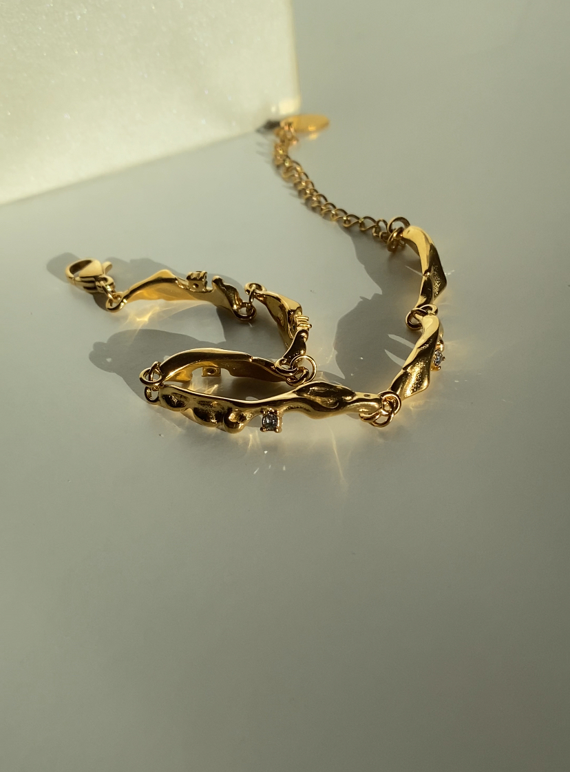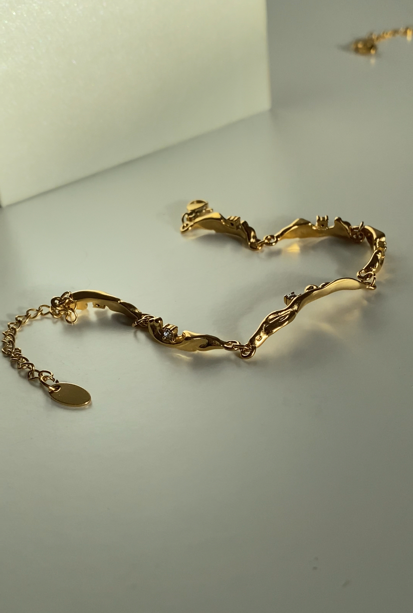 Dette elegante armbånd er guldbelagt, vandfast og rustfrit, hvilket giver både skønhed og langvarig holdbarhed. Det er justerbart for en perfekt pasform og prydet med funklende cubic zirkonia sten, der tilføjer et strejf af luksus.
