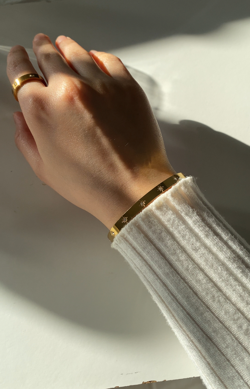 LUNA bangle er både elegant og holdbar, designet med funklende cubic zirkonia sten. Armringen er robust, rustfri og guldbelagt, hvilket giver den et luksuriøst udseende, samtidig med at den er vandfast og modstandsdygtig over for daglig brug. Perfekt til både hverdagsbrug og festlige lejligheder.